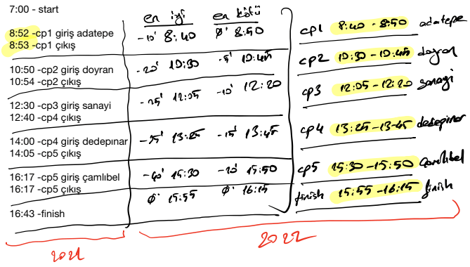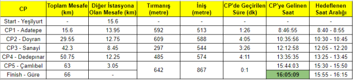Ancak bu sene 3. kez 66K parkurunda koşacağım ve parkurda başıma nelerin gelebileceğini biraz da olsa kestirebildiğimden dolayı yarış öncesinde kendimi daha sakin ve planlı olmaya odakladım. Hatta yarış öncesinde, 2021 yılı CP sürelerimi de detaylıca inceleyip hangi CP’ye hangi zaman aralıklarında gelebileceğimin planlamasını dahi yapmış, bu verileri sevgili eşim Fatma ve Mehmet Ali Ok ile paylaşmıştım. Olur da CP’lere gelirlerse hangi zaman dilimlerinde gelmeyi planladığımı bilmeleri önemliydi. Bu noktadan sonra hedefim, kendi küçük yarış dünyamda belirlediğim zaman aralıklarında CP’lere gelmek ve sağlıklı bitirmeye dönüşmüştü.