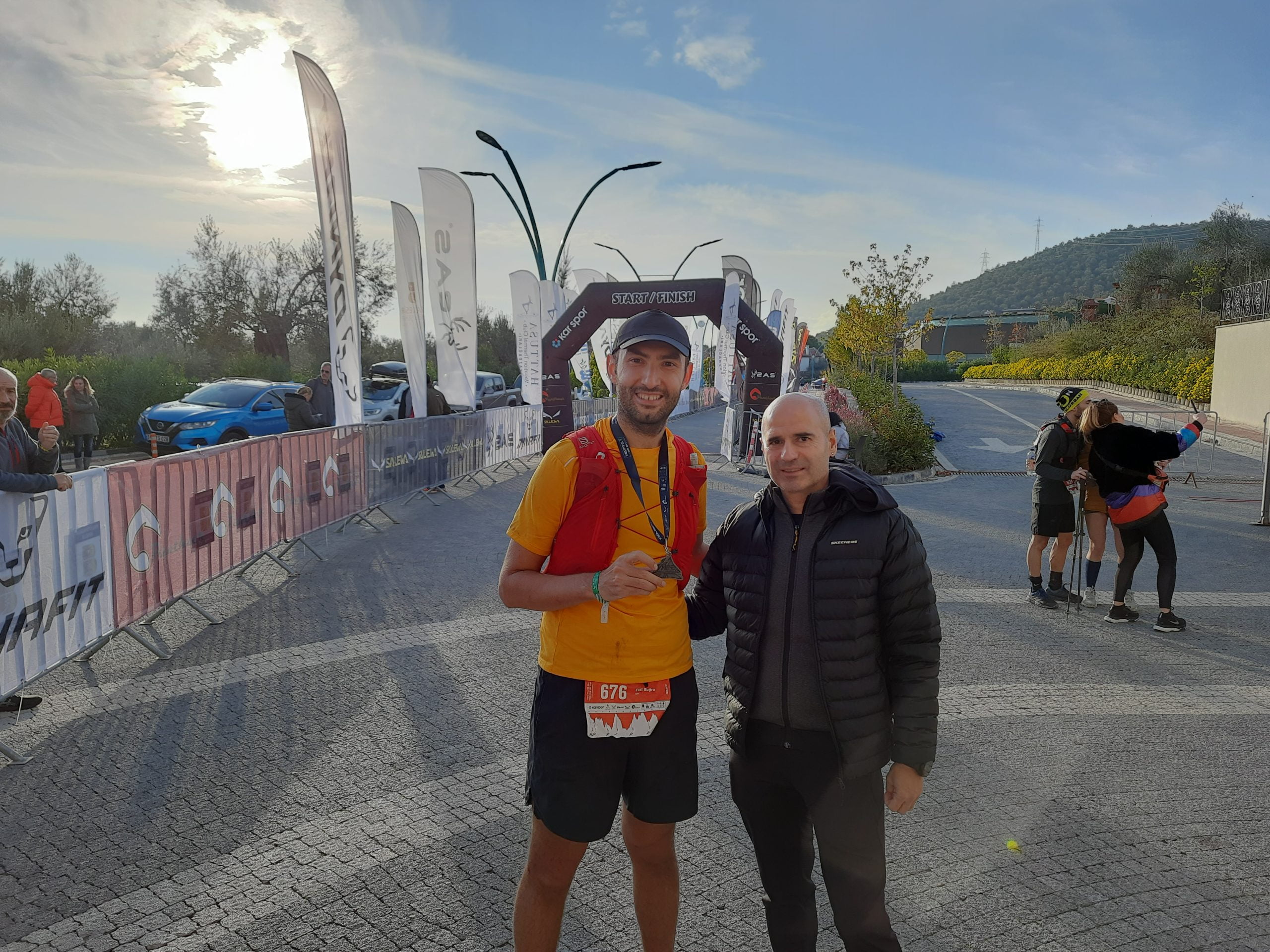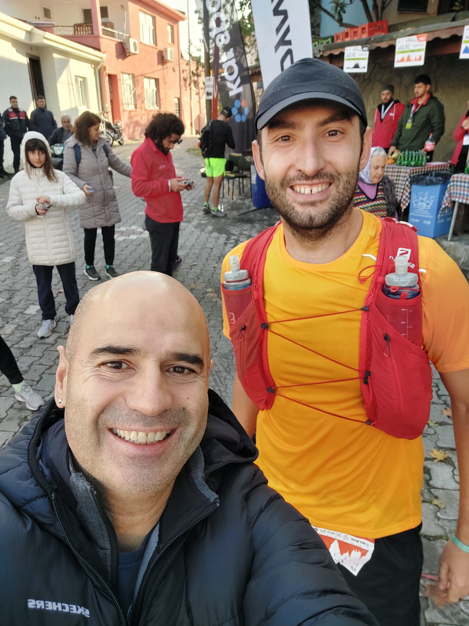 Maalesef, yarıştan 1 hafta öncesinde başlayan, iş yoğunluğundan ötürü kontrol ettiremediğim hafif diş ağrısı, yarıştan bir gün önce tam da dinlenmem gereken gece fena bir şekilde atağa geçti ve beni uyutmamak için elinden geleni yaptı. Birkaç saatlik kıvranma seansından sonra 3-4 saatlik sakin bir uyku çekebildim. Cumartesi saat 04:30 itibariyle uyanıp, bol su ve esnetme hareketleriyle, biz koşucuların en üst korkularından biri olan, yarış boyunca gelen büyük tuvalet ihtiyacımı sabah giderebildim. Rahat bir oh çektikten sonra Metin Özvarna ile birlikte restauranta inip, yanımda getirdiğim fıstık ezmesi ve – tüm uzun antreman ve yarışlar öncesi, uzun süreli enerji kaynağı olarak fıstık ezmesi yemeye çalışıyorum – hazırladığım hafif kahvaltıyı mideye indirirken son yarış istişarelerimizi tamamladık. Hızlıca odalarımıza dönerek, kıyafetlerimizi giyindik, çantamızı yanımıza alıp, son malzeme kontrollerimizi yaparak ve 06:00’da hareket eden ve bizi başlangıç noktası olan Yeşilyurt Köyü’ne taşıyacak servislerde yerimizi aldık. Yine bu servislerin kaldığımız otel Hattuşa’nın tam önünden kalkması, ulaşım açısından, işimizi çok kolaylaştırıyordu. Yaklaşık 35-40 dk’lık bir otobüs yolculuğu sonrası Yeşilyurt köyüne varmış, son 5-10 dk’mızı üşümemek için köyün kahvesinde geçirmeye karar vermiştik. Kendimi yarış başlangıcı öncesi saran hafif stresin kontrolüne bırakıp etraftaki insanların giyimlerini ve hangi malzemeleri yanına aldıklarını teker teker inceliyordum. Sabah soğukluğuna aldanmayıp şapka, kısa kollu tişört ve şort ile başlamaya karar vermiş; yanıma eldiven, uzun kollu ara katman ve yağmurluğumu almıştım. Ancak insanların giydiği uzun kollu tişört, tayt ve yağmurlukları görünce tedirgin olmadan edemedim. O anda da Metin Özvarna abi, tecrübenin getirdiği rahatlıkla kahvede çayını yudumlayıp yarış zamanının gelmesini bekliyordu 🙂